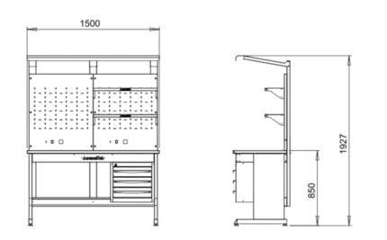 • Plan de travail en inox, intérieur en bois rouge